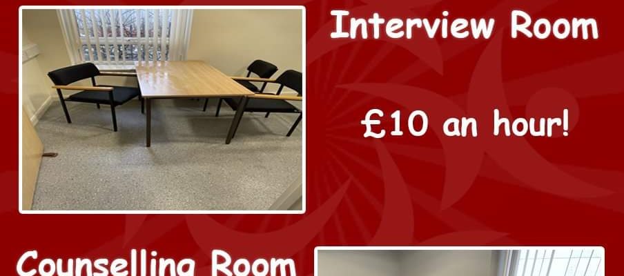 Our dedicated Counselling and Interview rooms are available to booked for just £10.00 per hour.